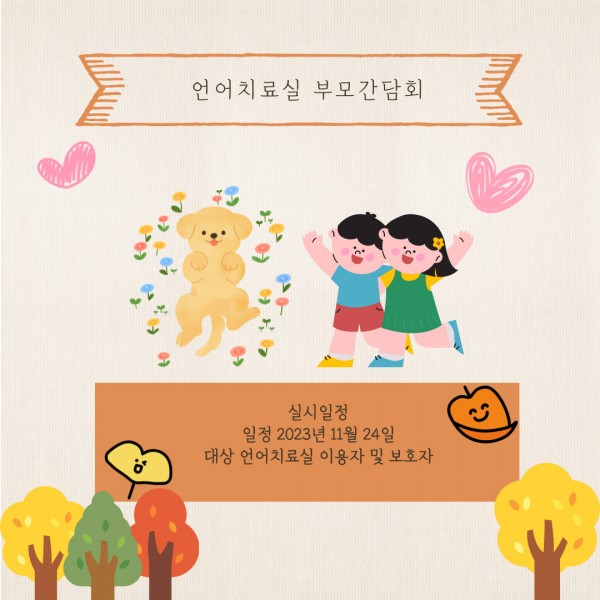 하반기언어치료실부모간담회 (11/24 ~ 11/24) 페이지 정보 작성자 권경호 작성일 23-11-03 11:48 조회538회 본문 하반기언어치료실부모간담회를 실시합니다. 이전글 다음글 목록